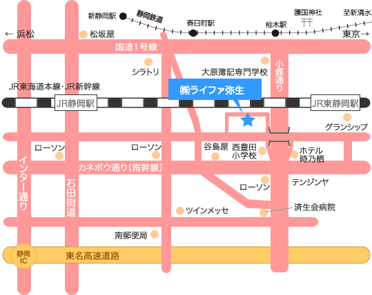 | <お車でお越しの方> 駐車場あり 東名静岡インターより 約10分 <電車でお越しの方> 東静岡駅より徒歩10分 |
