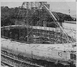 私が特に興味を感じたことは「近似楕円モダンな姿」と発表になった建築構想でした。この状況を把握するため、建築構造の底辺基礎工事から進む状況をカメラに収め記録したことです。今では見ることの出来ない中間工事の様子を懐かしく思い出します。 |